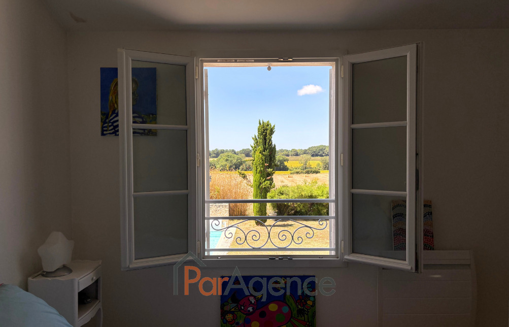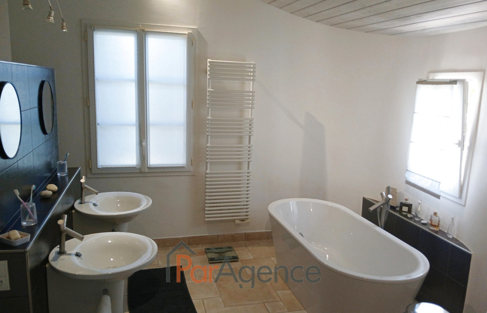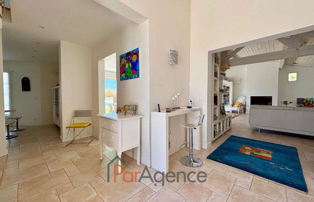 SAINT-SULPICE-DE-ROYAN dans un quartier calme, une maison d'architecte de 2005 comprenant 5 PP pour environ 204 m2 habitables : Hall d'entrée avec placard, vaste salon avec cheminée et salle à manger attenante très lumineux ouvrant sur terrasse et jardin, cuisine équipée ouvrant sur terrasse et jardin, suite parentale avec dressing et salle de bains avec baignoire et douche à l'italienne et wc. Une pièce ouvrant sur jardin, wc et lave-mains. Lingerie-chaufferie. Local technique piscine. A l'étage : Deux chambres dont une avec placard et grand rangement, salle d'eau avec wc éclairée par vélux. Chauffage par le sol pompe à chaleur au rez-de-chaussée et convecteurs électriques à l'étage. Un garage double de 42 m2.Une cave climatisée. Piscine chauffée 9X4 m et Pool-house. Le tout sur un terrain clos et sans vis à vis de 1631 m2. Les informations sur les risques auxquels ce bien est exposé sont disponibles sur le site Géorisques : www.georisques.gouv.fr. Honoraires agence à la charge du vendeur. https://www.par-agence.fr/nos-honoraires.