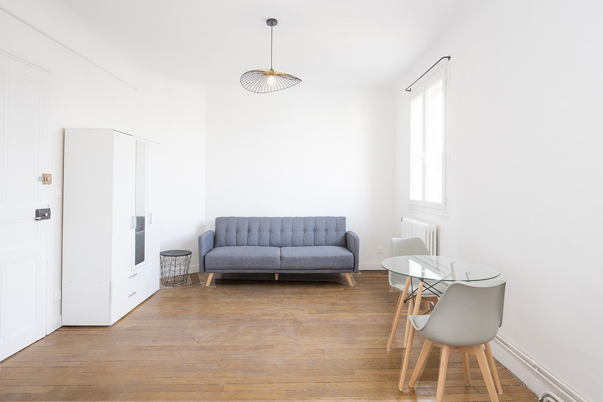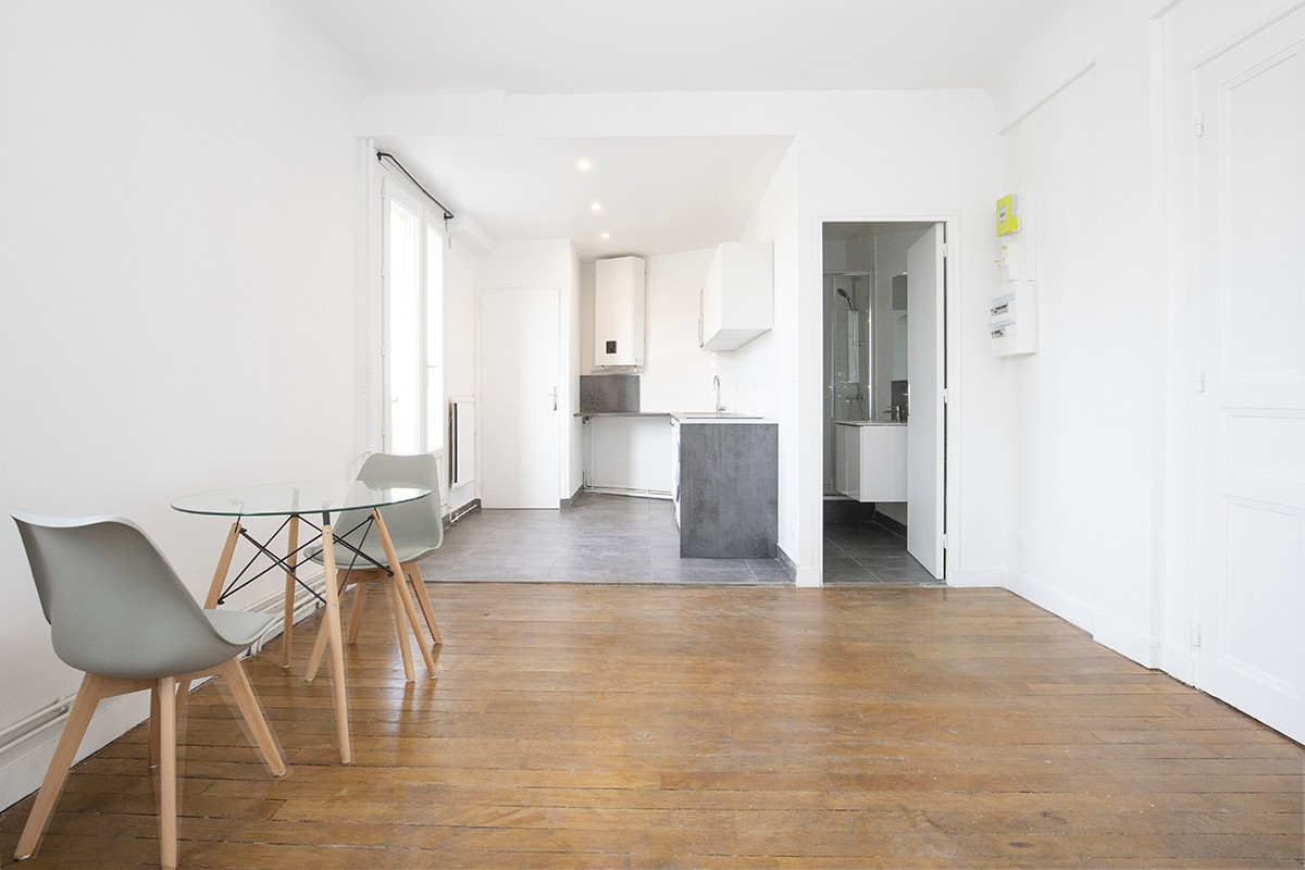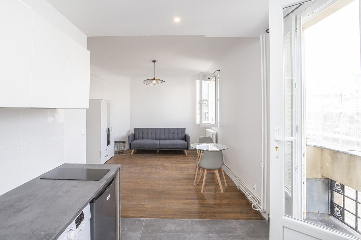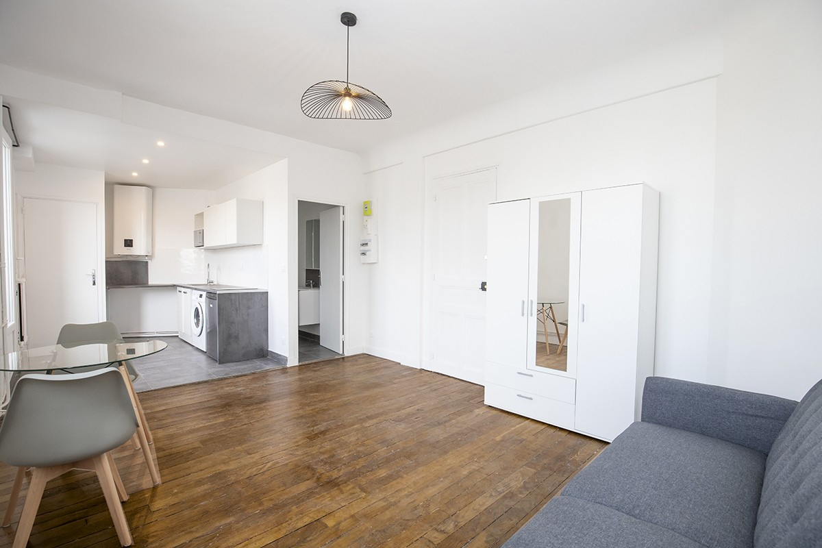 GUY MOQUET - A 200m du métro "GUY MOQUET" (ligne 13), et proche des commerces, dans un immeuble ancien BIEN ENTRETENU en PIERRE ET BRIQUE, au 6ème étage avec ascenseur un STUDIO TRES BON ÉTAT général de 27.14m² avec PARQUET composé comme suit : une pièce de vie exposée OUEST AVEC VUE DÉGAGÉE, cuisine ouverte ÉQUIPÉE et AMÉNAGÉE, une salle d'eau ainsi qu'un VRAI WC séparé. chauffage collectif et eau individuel. Disponible de suite. Honoraires d'agence TTC : 407.10 euros / Dépôt de garantie : 2050 euros Copropriété de 47 lots (Pas de procédure en cours).