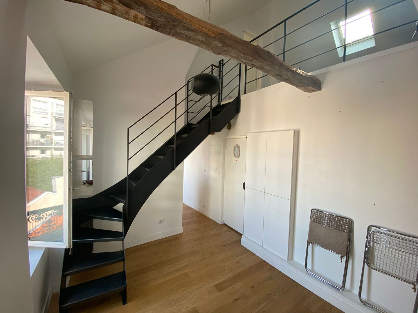 Paris 18, métro La Chapelle, Rue Philippe de Girard, dans immeuble ancien bien entretenu, au 5eme étage sans ascenseur, 2/3 pièces MEUBLE de 58,63m2 ( 39,01m2 loi carrez) composé au 5ème étage d'un séjour, une cuisine séparée ( equipée et aménagée), salle d'eau avec wc et au 6ème étage une pièce palière ( bureau, chambre d'appoint), une chambre avec rangements. Poutres apparentes, parquet au sol, beaucoup de cachet, état impeccable, très lumineux et calme. Chauffage et eau individuels electriques. Disponible de suite, honoraires d'agence TTC : 585,15 euros