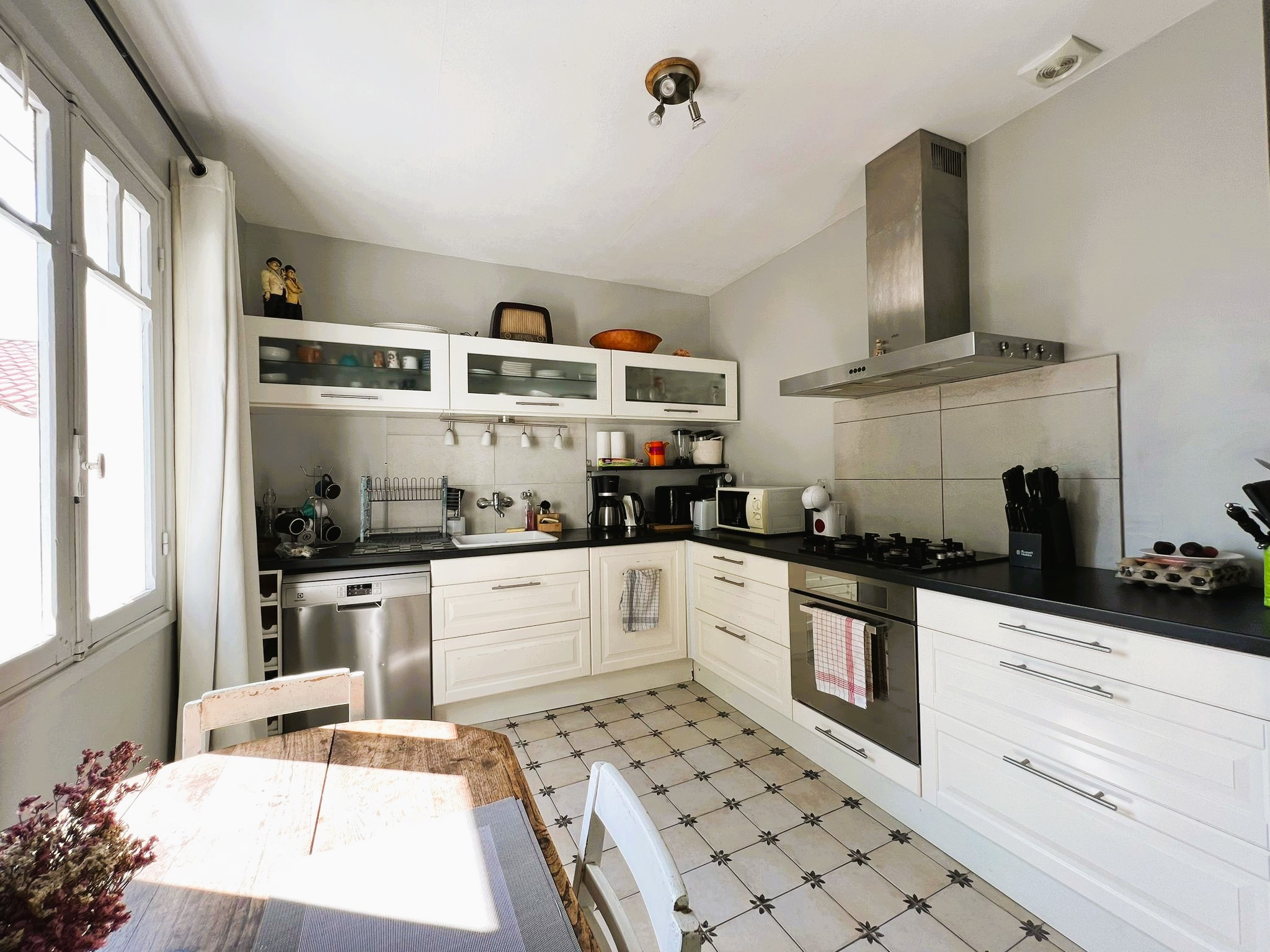 L'agence CHARTREUX IMMOBILIER vous pr�sente, dans un quartier pris� de Royan � proximit� de la plage et des commerces, une VILLA datant de 1925 d'environ 104 m2 de surface habitable ayant b�n�fici� d'une extension de 20 m2 par un STUDIO ind�pendant en 2018.<br> Cette agr�able DEMEURE propose :<br>- au rez-de-chauss�e : hall d'entr�e avec placard, s�jour, cuisine �quip�e (plaques gaz, hotte, four, lave-vaisselle, frigo) ouvrant sur cour expos�e SUD, d�gagement, WC, salle d'eau (douche � l'italienne), chambre.<br>- � l'�tage : palier, deux chambres ouvrant sur balcon avec placard, salle de bains avec WC. Grenier mansard�.<br>- en sous sol : cave (d�shumidificateur, adoucisseur, chaudi�re gaz).<br>- un STUDIO : s�jour avec coin-cuisine ouvrant sur terrasse, WC, mezzanine et salle d'eau � l'�tage.<br>- un Abri de jardin de 9 m2.<br> <br>Chauffage : gaz<br>